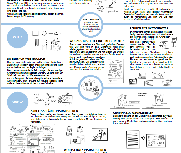 Sketchnotes können den Unterrichtsalltag erleichtern, bereichern und verschönern. Die Visualisierungen können Abläufe und Regeln deutlich machen, Grammatikkonzepte erklären, Vokabeln veranschaulichen, Ausgangspunkt für Reflexion sein, Texte… Weiterlesen »Sketchnotes in meinem Unterricht (Herbst 2024)