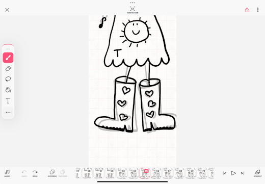 Ich habe mich gleich auf die Suche nach einem Programm gemacht, mit dem ich auch solche Animationen ausprobieren könnte und bin dank eines Tipps von Lai Chee auf Flipaclip (https://flipaclip.com/) gestoßen. In Flipaclip kann man, ähnlich wie in einem Daumenkino, die einzelnen Frames zeichnen und dann in unterschiedlichen Geschwindigkeiten abspielen lassen, wobei ich meine Animationen momentan bei nur 8fps ansiedle. Alles andere würde zu viel Zeit in Anspruch nehmen.