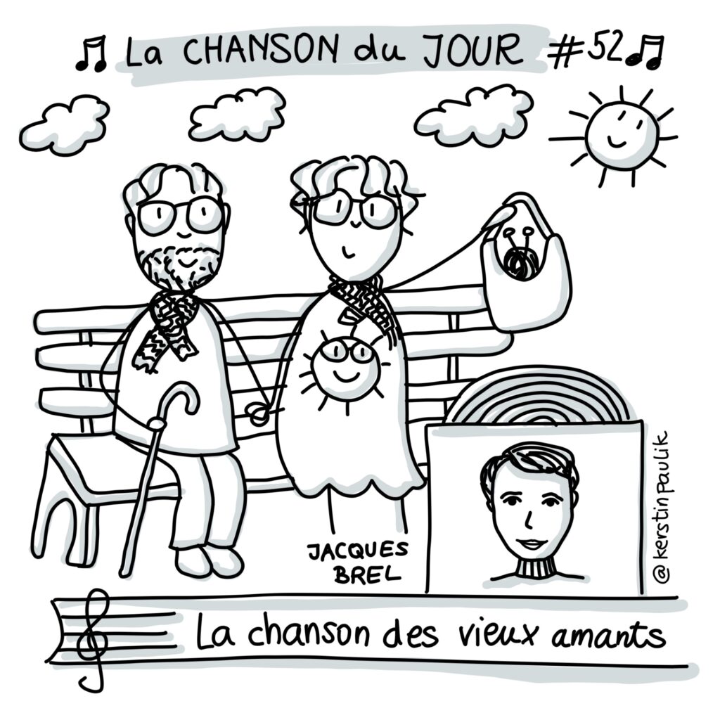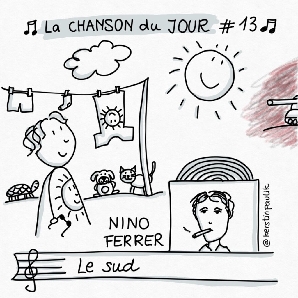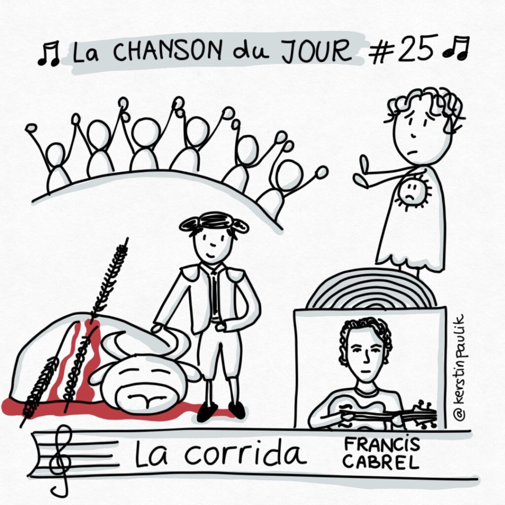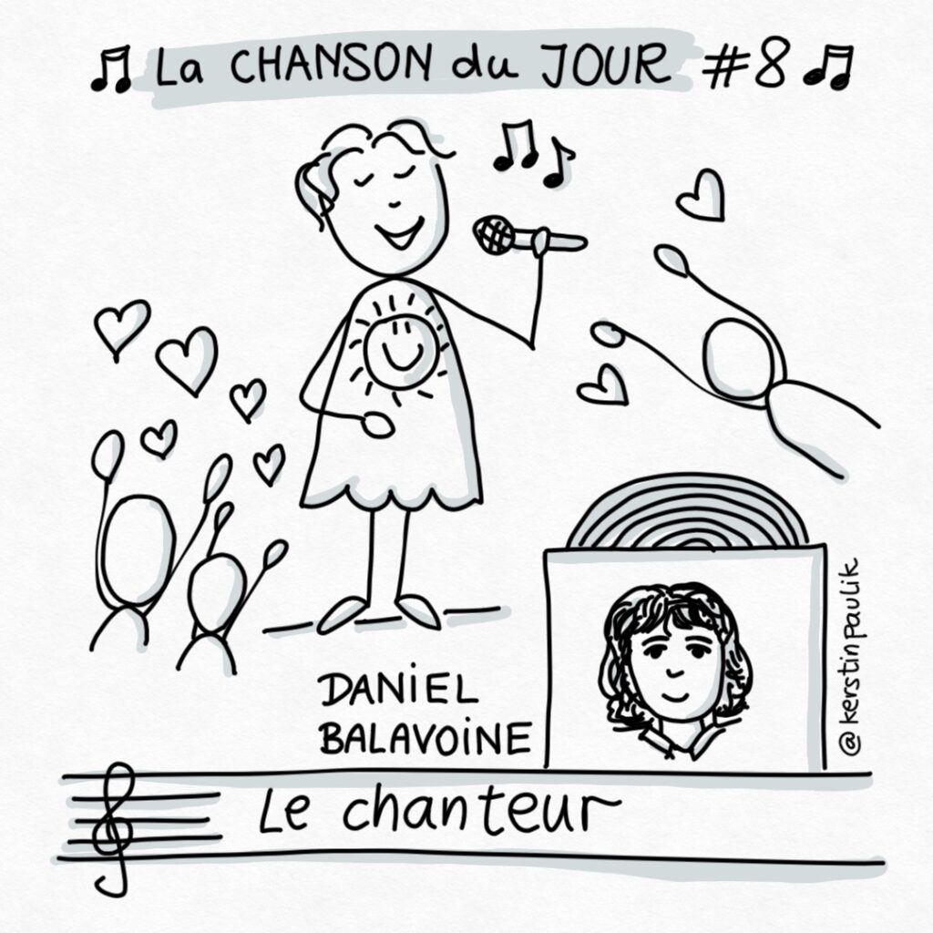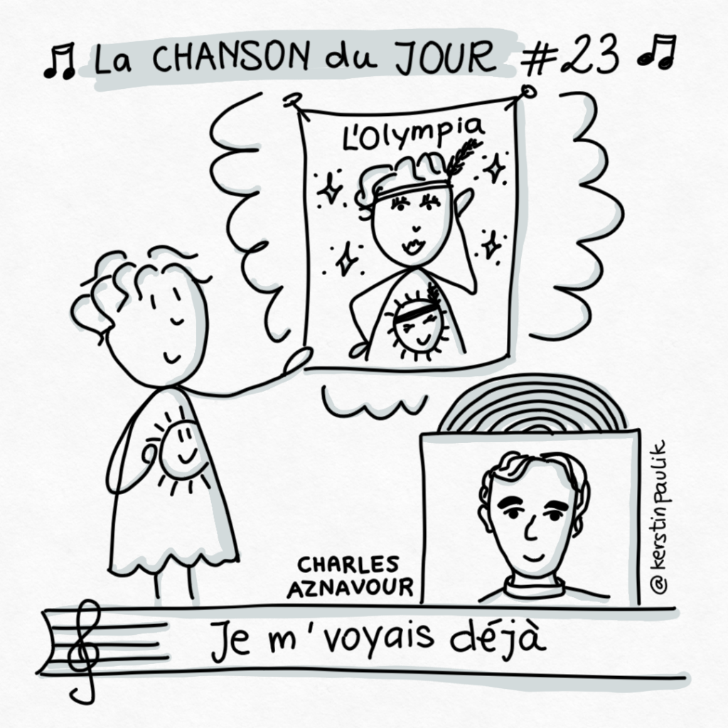 Ein Effekt dieses morgendlichen Zeichnens war, dass ich den ganzen Tag das Lied „My favorite things“ von Julie Andrews im Ohr hatte. 😉 Dabei kam mir dann die Idee, dass es auch lustig wäre, einmal Lieder zu zeichnen. Im Mai 2024 habe ich mich dann an ein Zeichenprojekt gemacht, bei dem ich jeden Tag ein französisches Lied, das mir gerade durch den Kopf ging, zeichnen wollte. Da ich ständig französische „Ohrwürmer“ habe, gab es dafür mehr als genug Stoff. 😉 Außerdem hatte ich mir gerade mein erstes iPad gekauft, wollte mich mit den erweiterten Funktionen meines Zeichenprogramms vertraut machen und das Zeichnen von Porträts üben.