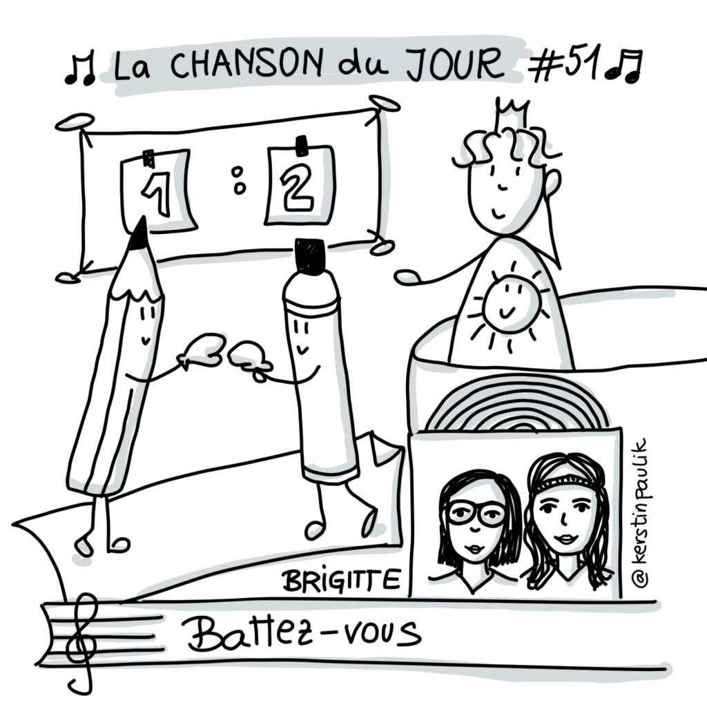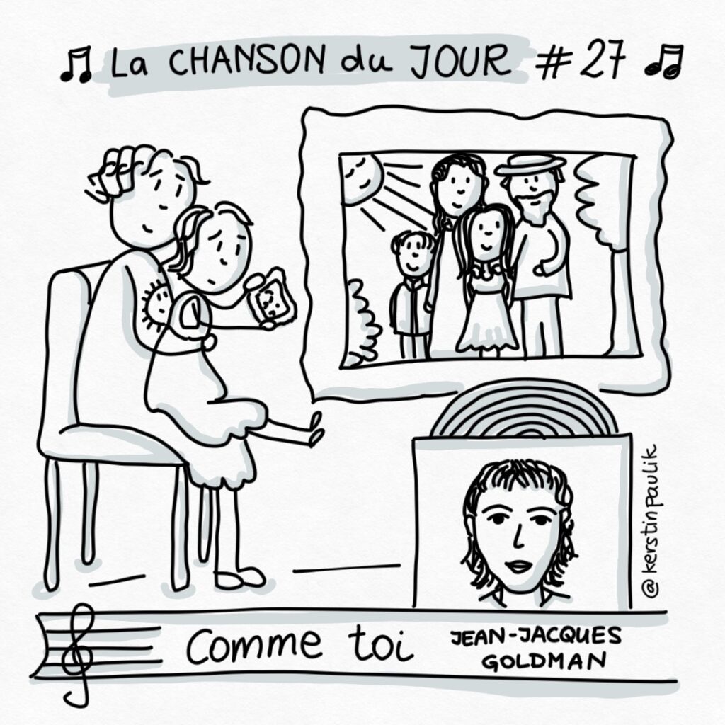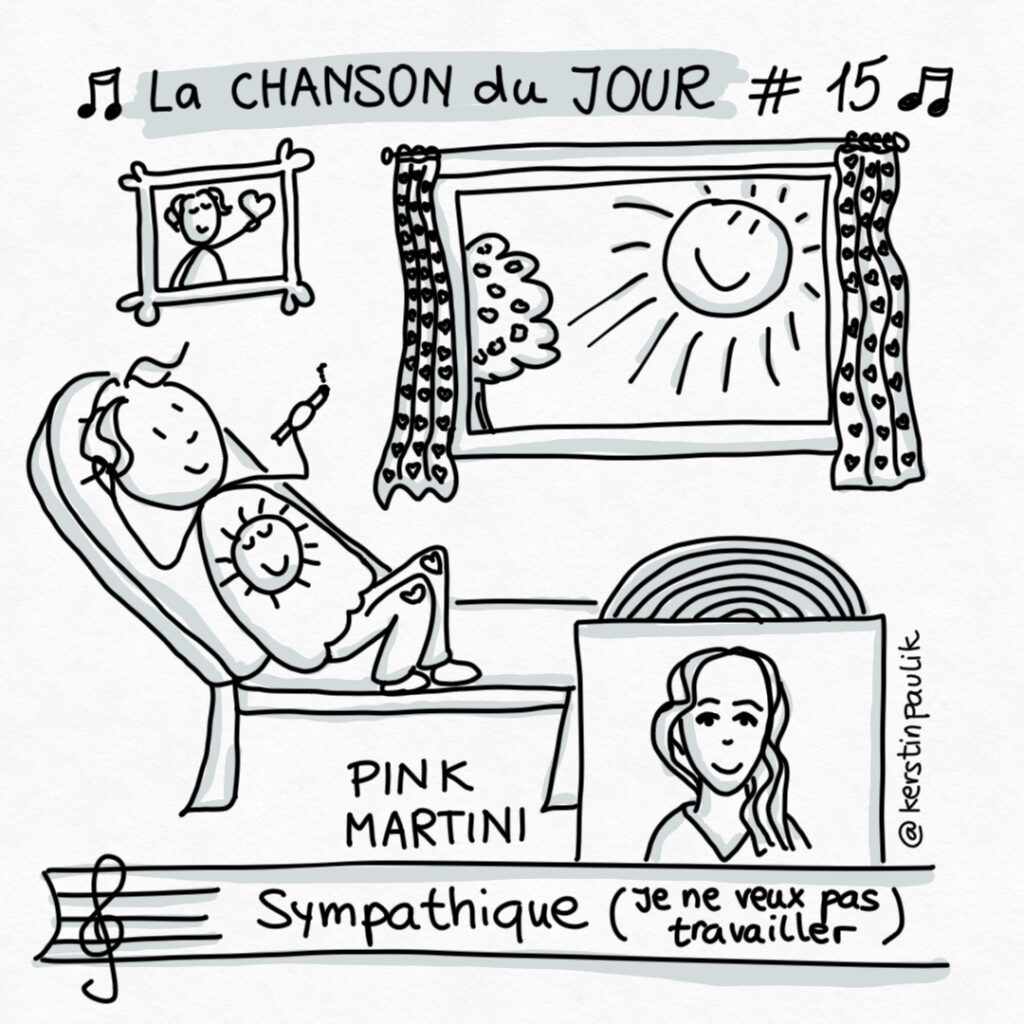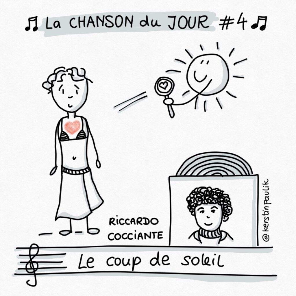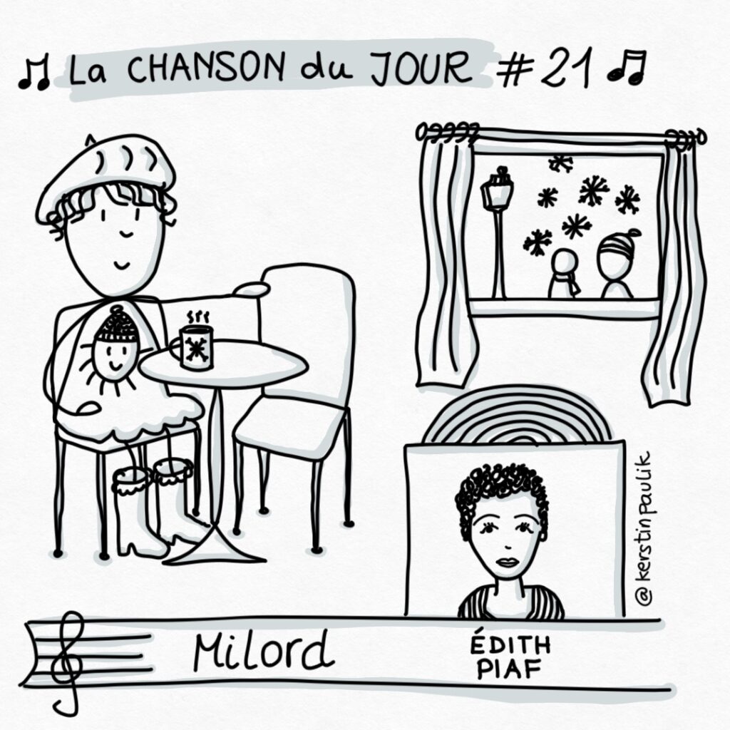 Ein Effekt dieses morgendlichen Zeichnens war, dass ich den ganzen Tag das Lied „My favorite things“ von Julie Andrews im Ohr hatte. 😉 Dabei kam mir dann die Idee, dass es auch lustig wäre, einmal Lieder zu zeichnen. Im Mai 2024 habe ich mich dann an ein Zeichenprojekt gemacht, bei dem ich jeden Tag ein französisches Lied, das mir gerade durch den Kopf ging, zeichnen wollte. Da ich ständig französische „Ohrwürmer“ habe, gab es dafür mehr als genug Stoff. 😉 Außerdem hatte ich mir gerade mein erstes iPad gekauft, wollte mich mit den erweiterten Funktionen meines Zeichenprogramms vertraut machen und das Zeichnen von Porträts üben.
