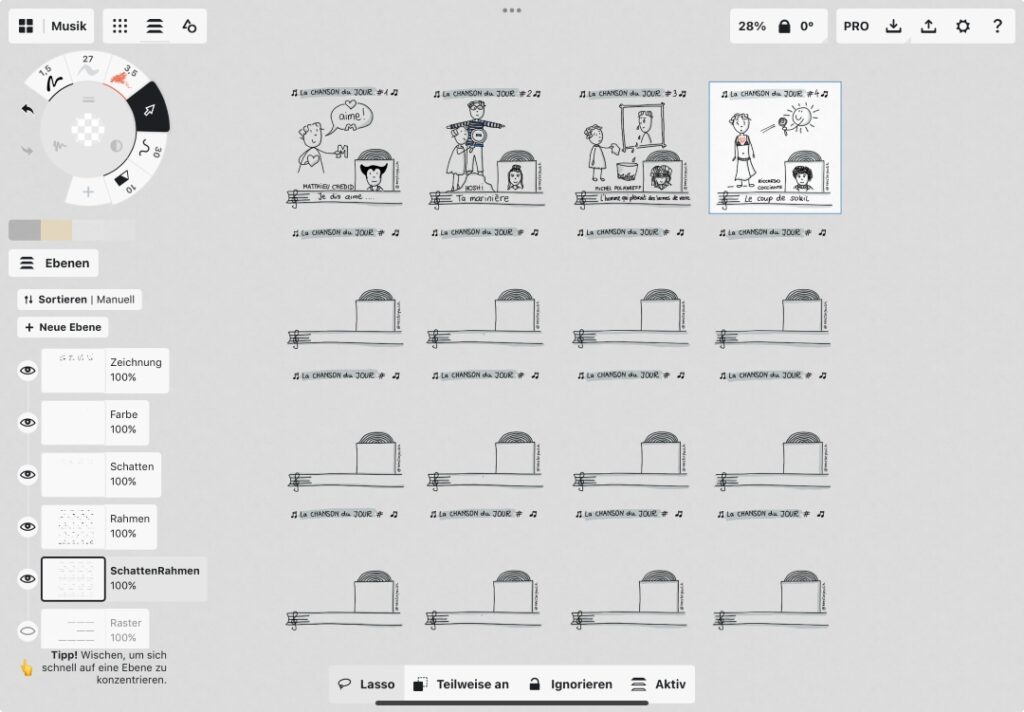 In meinem Zeichenprogramm „Concepts“ habe ich zuerst einen fixen Rahmen entwickelt, in den die Lieder eingebettet werden können und ihn 16mal kopiert. Erfahrungsgemäß sind für mich bei persönlichen Projekten 14-16 Tage ein guter Zeitraum, um wirklich spontan und mit Freude zeichnen zu können. Bei längeren Perioden kann es sich leicht wie eine Verpflichtung anfühlen und wenn ich das Gefühl habe, mich zu etwas zwingen zu müssen, oder ich mich in Details und Perfektionismus verliere, höre ich dann lieber auf. Ich habe die Bilder jeden Tag auf Instagram und WhatsApp geteilt und am Ende auch kleine Heftchen daraus gebastelt, was mir unheimlich viel Spaß gemacht hat. Damit es einfacher ist, die Lieder auch anzuhören, habe ich am Ende auch eine YouTube-Playlist zusammengestellt.