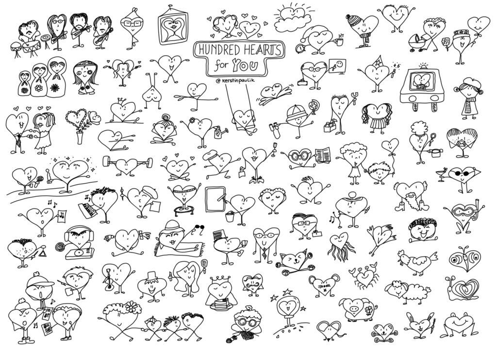 Ich liebe es, Herzen zu zeichnen und sie dann zu kleinen Figuren auszugestalten. Anfang des Monats habe ich so für eine Freundin 100 Herzen-Figuren gezeichnet, um sie eine bisschen aufzuheitern. Das hat mich dann darauf gebracht, dass diese Technik auch für eine Valentinskarte gut geeignet sein müsste. Um zu zeigen, wie’s gehen kann, habe ich ein FlipaClip Video und eine Sketchnote gestaltet.